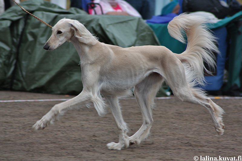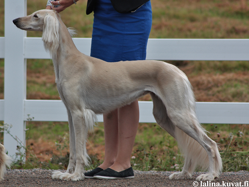 " Hyvä rotu- ja skpleima. Erinomainen ryhti. Kaunis pää, jossa erinomaiset mittasuhteet. Pienehköt silmät, hyvät korvat. Erinomainen kaula, joka liittyy hyvin runkoon. Eturinta voisi olla hieman voimakkaampi ja eturaajat paremmin rungon alla. Hyvät ranteet ja tassut. Erinomainen rintakehän syvyys. Aavistuksen lyhyt runko, voimakas lanne. Erinomaiset polvi- ja kinnerkulmaukset. Hyvä turkki. " |